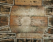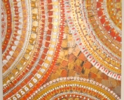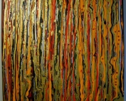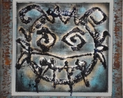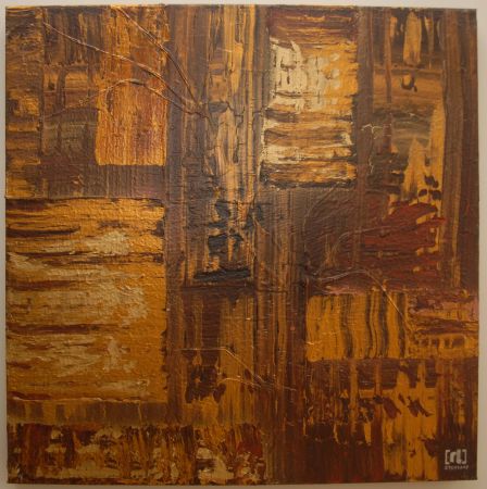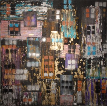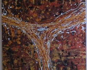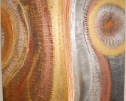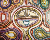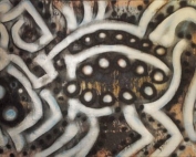 I began just painting basic shapes: squares, circles, spirals – and trying to add some sort of an effect to make the colours stands out. I swapped acrylics for DIY centre metallic and gloss paints, started shifting the colours around with scrapers. Then I tried cutting the skin of the half-dry paints and scratching effects into the background.