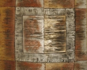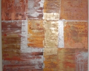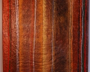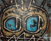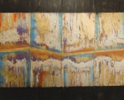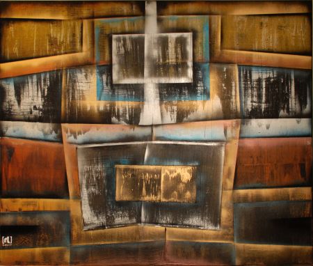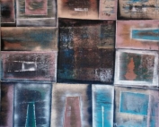 I figured spraying metallic paints over the matt and gloss below would look good if I could speed-dry the surface of the paint to make it crack and tear. After that I found I could get an antique effect by working in copper and rust patinas.
