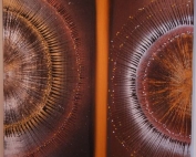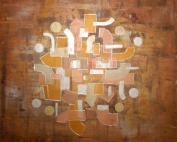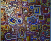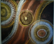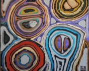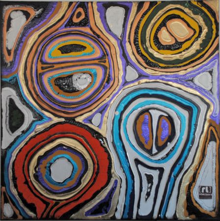 I began just painting basic shapes: squares, circles, spirals – and trying to add some sort of an effect to make the colours stands out. I swapped acrylics for DIY centre metallic and gloss paints, started shifting the colours around with scrapers. Then I tried cutting the skin of the half-dry paints and scratching effects into the background.
